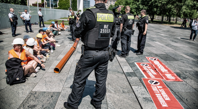 6. Juni: Umweltdemonstrationen: In Neuperlach (Bayern) klettern fünf Personen auf einen Baukran und hängen dort ein Banner auf. Als die Polizei eintrifft, versuchen sie zu fliehen; drei von ihnen werden vorübergehend festgenommen. Am 16. Juni wird durch eine Presseanfrage bekannt, dass die StA Berlin insgesamt 65 Ermittlungsverfahren gegen Klimaaktivist*innen führt; über eine Anklageerhebung wurde bisher noch in keinem Fall entschieden. Vier vermummte Klimaaktivist*innen klettern am 17. Juni auf den Balkon der SPD-Zentrale in Berlin und entrollen dort ein Spruchbanner während vor dem Gebäude 10 weitere Aktivist*innen Plakate hochhalten. Die Polizei räumt die Ansammlung, aktiver Widerstand wird dabei nicht geleistet. Am 20. Juni blockieren etwa 80 Klimaaktivist*innen wieder neun Autobahnauffahrten und Kreuzungen in Berlin; die Polizei löst die Blockaden rasch auf. Auch am 21. Juni blockieren Klimaaktivist*ìnnen in Berlin mehrere Autobahnzufahrten; es kommt zu Auseinandersetzungen mit Autofahrer*innen. Am dritten Tag infolge demonstrieren am 22. Juni Umweltaktivist*innen in Berlin. Diesmal treffen sich etwa 20 Personen zu einer Kundgebung vor dem Bundeskanzleramt. Am gleichen Tag teilt die StA Berlin auf Pressenachfrage mit, dass sie aktuell insgesamt 59 Ermittlungsverfahren gegen Aktivist*innen führt, hauptsächlich wegen Nötigung und Widerstand. Demgegenüber hat die Polizei seit Anfang des Jahres bereits insgesamt 485 Verfahren eingeleitet. Erneut blockieren am 23. Juni rund 65 Klimaaktivist*innen einen wichtigen Verkehrsknotenpunkt; 45 von ihnen kleben sich auf der Straße fest. Bezirksbürgermeisterin Clara Herrmann solidarisiert sich vor Ort mit den Blockierer*innen. Den dritten Tag infolge blockieren Umweltaktivist*innen auch am 24. Juni wieder Autobahnen in Berlin. Am 27. Juni blockieren etwa 80 Klimaaktivist*innen anlässlich des G-7-Gipfels auf Schloss Elmau (Bayern) drei Eingänge des Bundesfinanzministeriums in Berlin. Drei Gruppen von je 10 Klimaaktivist*innen blockieren am 29. Juni Berliner Autobahnauffahrten, indem sie sich dort festkleben. Am 30. Juni sind es rund 40 Aktivist*innen, nach der Räumung versuchen einige Personen erneut auf die Fahrbahn zu gelangen. Dabei wird ein Protestierer zu Fall und danach mit einer Schulterverletzung ins Krankenhaus gebracht.